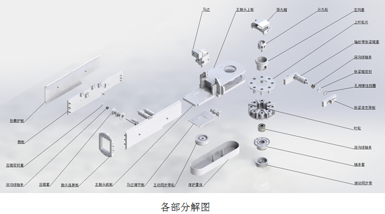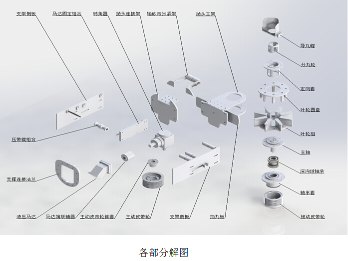 功能描述:拋頭包含拋頭支架、液壓馬達(dá)(博世—力士樂)、葉輪組件、導(dǎo)向輪。待鋼管兩端被前后倉罩住后,液壓馬達(dá)啟動(dòng)并帶動(dòng)拋頭高速旋轉(zhuǎn)(根據(jù)管徑進(jìn)行設(shè)置拋射轉(zhuǎn)速),漏砂閥打開延時(shí)聽到鋼砂與金屬撞擊的聲音后液壓驅(qū)動(dòng)車向前推進(jìn)拋頭并進(jìn)入到鋼管內(nèi),輸砂伸臂上的旋轉(zhuǎn)支撐保證拋頭保持在鋼管軸線中心位置前進(jìn)。根據(jù)拋頭打出的拋射扇面調(diào)整鋼砂的供給量、拋射速度、拋頭行進(jìn)速度及鋼管的旋轉(zhuǎn)速度。
