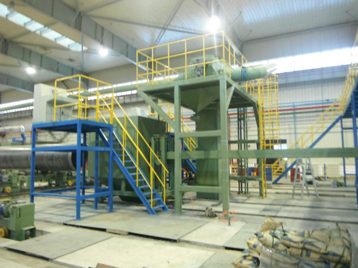 功能描述:內(nèi)壁拋丸除銹系統(tǒng)包含液壓站驅(qū)動車、輸砂伸臂、拋頭、提升機、分離器、回丸系統(tǒng)、打砂前倉、轉(zhuǎn)管裝置(或轉(zhuǎn)管車)、打砂后倉等。鋼管內(nèi)壁預(yù)熱后(高于室溫3°以上)轉(zhuǎn)運到內(nèi)壁除銹工位,前后倉將鋼管兩端密封,鋼管旋轉(zhuǎn)。液壓站、提升機、分離器、回丸系統(tǒng)、輸砂皮帶、拋頭馬達依次開啟,打開漏砂閥向前移動拋頭直至鋼管末端,然后返回到初位置。