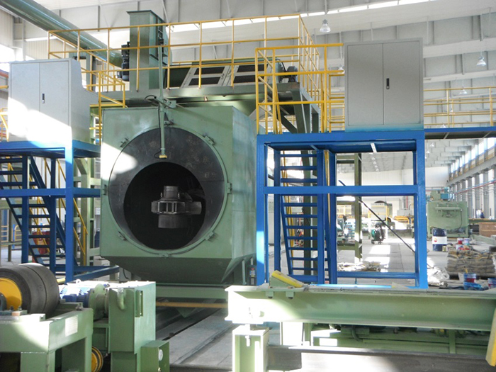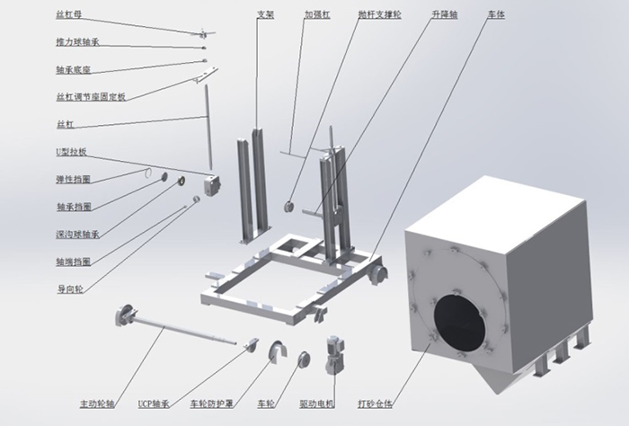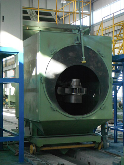 功能描述:內(nèi)壁拋丸除銹系統(tǒng)包含液壓站驅(qū)動車、輸砂伸臂、拋頭、提升機、分離器、回丸系統(tǒng)、打砂前倉、轉(zhuǎn)管裝置(或轉(zhuǎn)管車)、打砂后倉等。鋼管內(nèi)壁預(yù)熱后(高于室溫3°以上)轉(zhuǎn)運到內(nèi)壁除銹工位,前后倉將鋼管兩端密封,鋼管旋轉(zhuǎn)。液壓站、提升機、分離器、回丸系統(tǒng)、輸砂皮帶、拋頭馬達依次開啟,打開漏砂閥向前移動拋頭直至鋼管末端,然后返回到初位置。