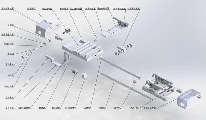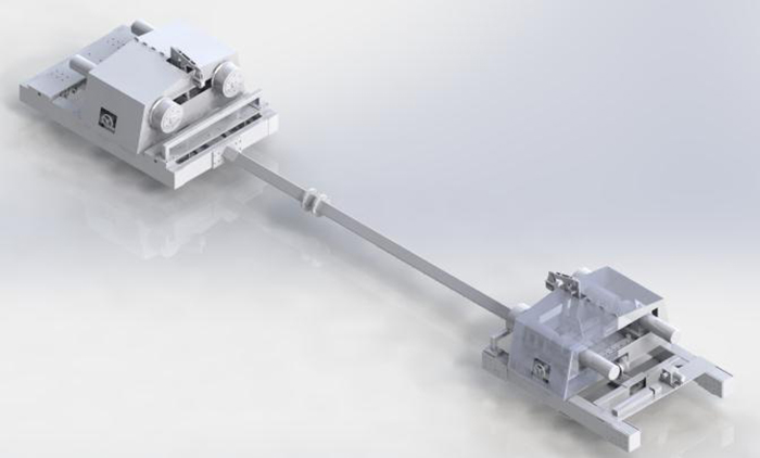 功能描述:旋轉(zhuǎn)運管車包含主動車、被動車、伸縮裝置等。鋼管在臺架上綁好鋼絲網(wǎng)掛鉤后,由運管車托舉運送到旋轉(zhuǎn)運管車工位,調(diào)整旋轉(zhuǎn)運管車位置滿足鋼管長度。運管車將鋼管放置到旋轉(zhuǎn)運管車的旋轉(zhuǎn)輥上,運管車回到原位。鋼管旋轉(zhuǎn),旋轉(zhuǎn)運管車前進以設(shè)定的速度經(jīng)過噴水、鋼絲網(wǎng)纏繞、水泥拋射輥,完成水泥配重層噴射工作。